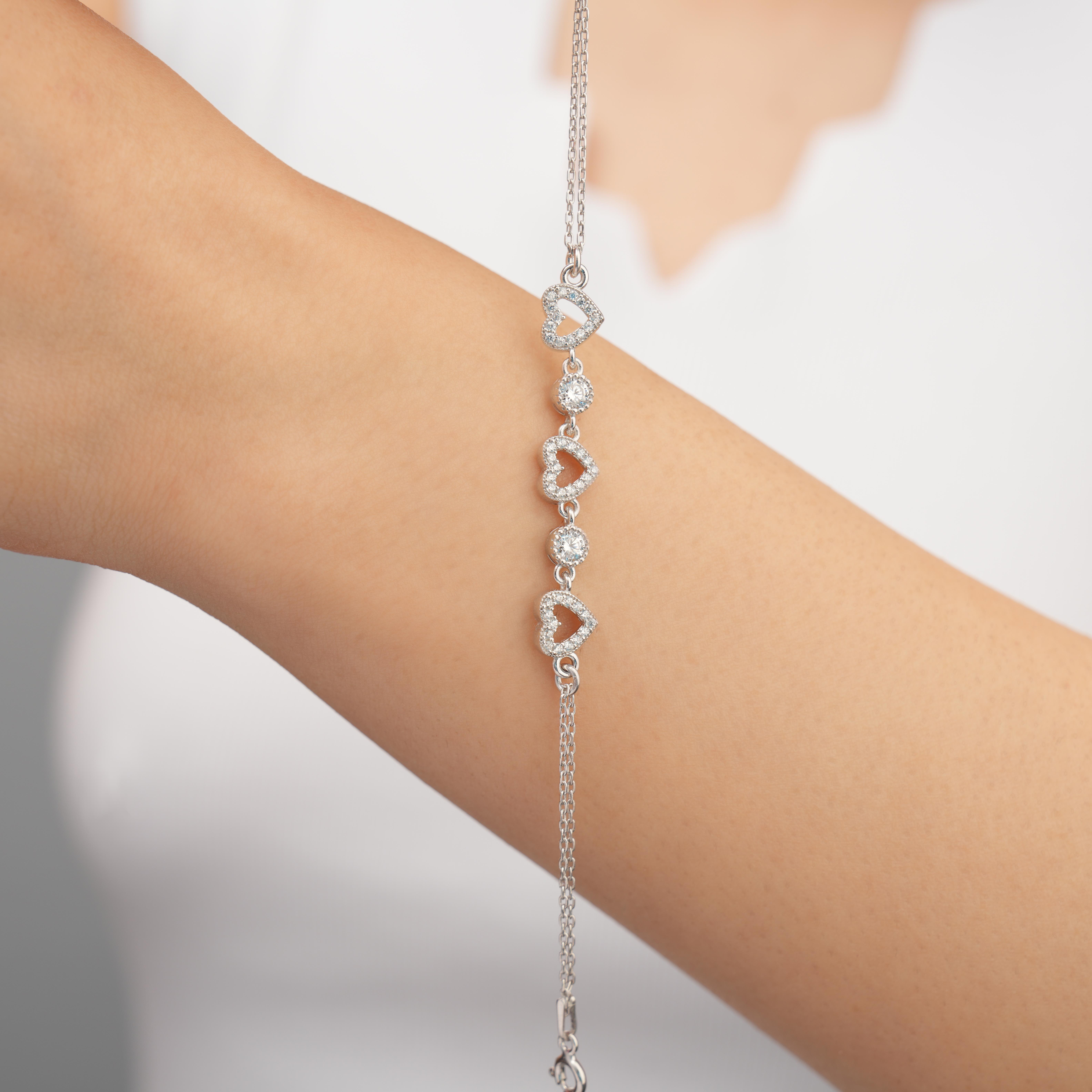 925 AYAR RODYUM KAPLAMA ZİRKON TAŞLI ÜÇ KALPLİ GÜMÜŞ BİLEKLİK