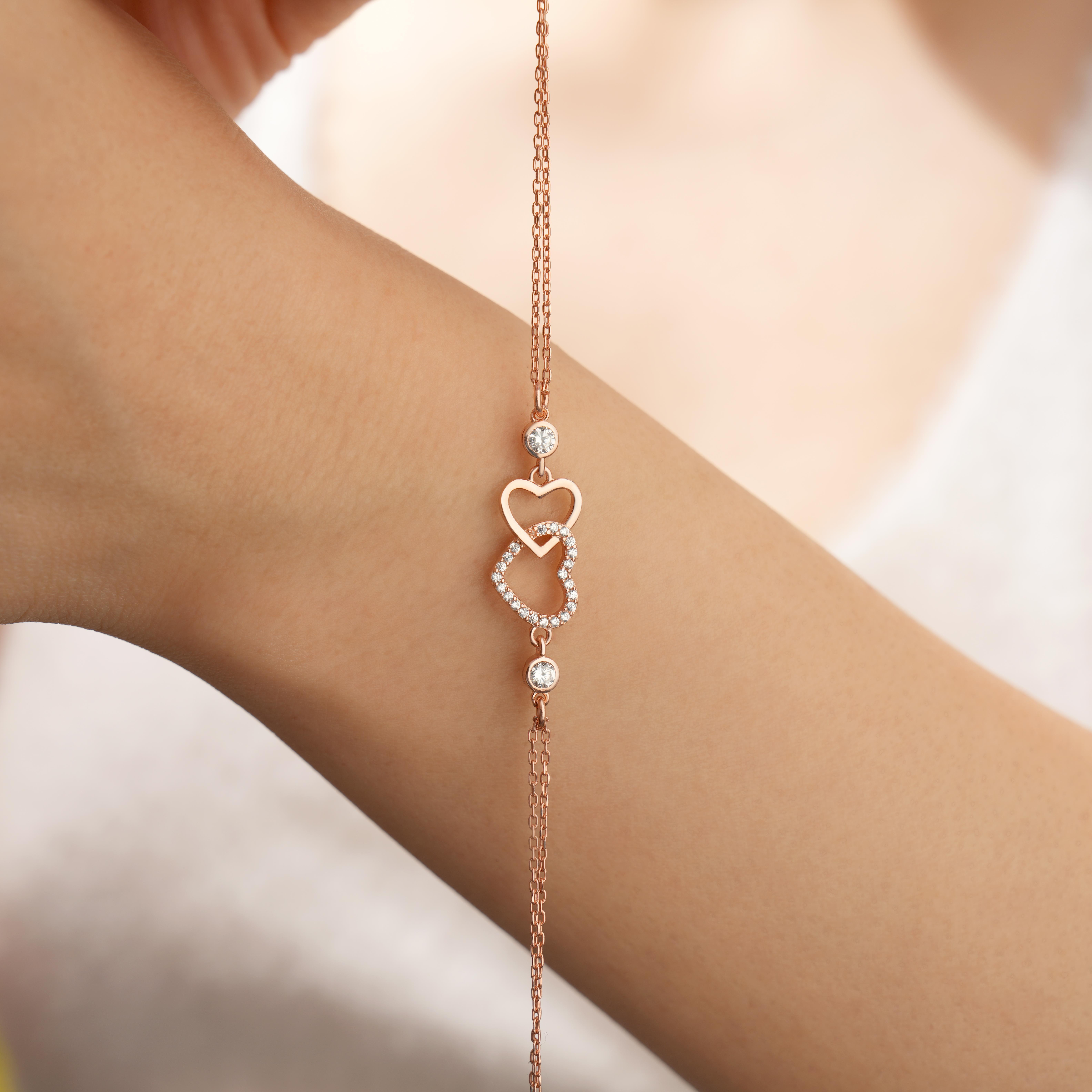 925 AYAR ROSE KAPLAMA ZİRKON TAŞLI ÇİFT KALPLİ GÜMÜŞ BİLEKLİK