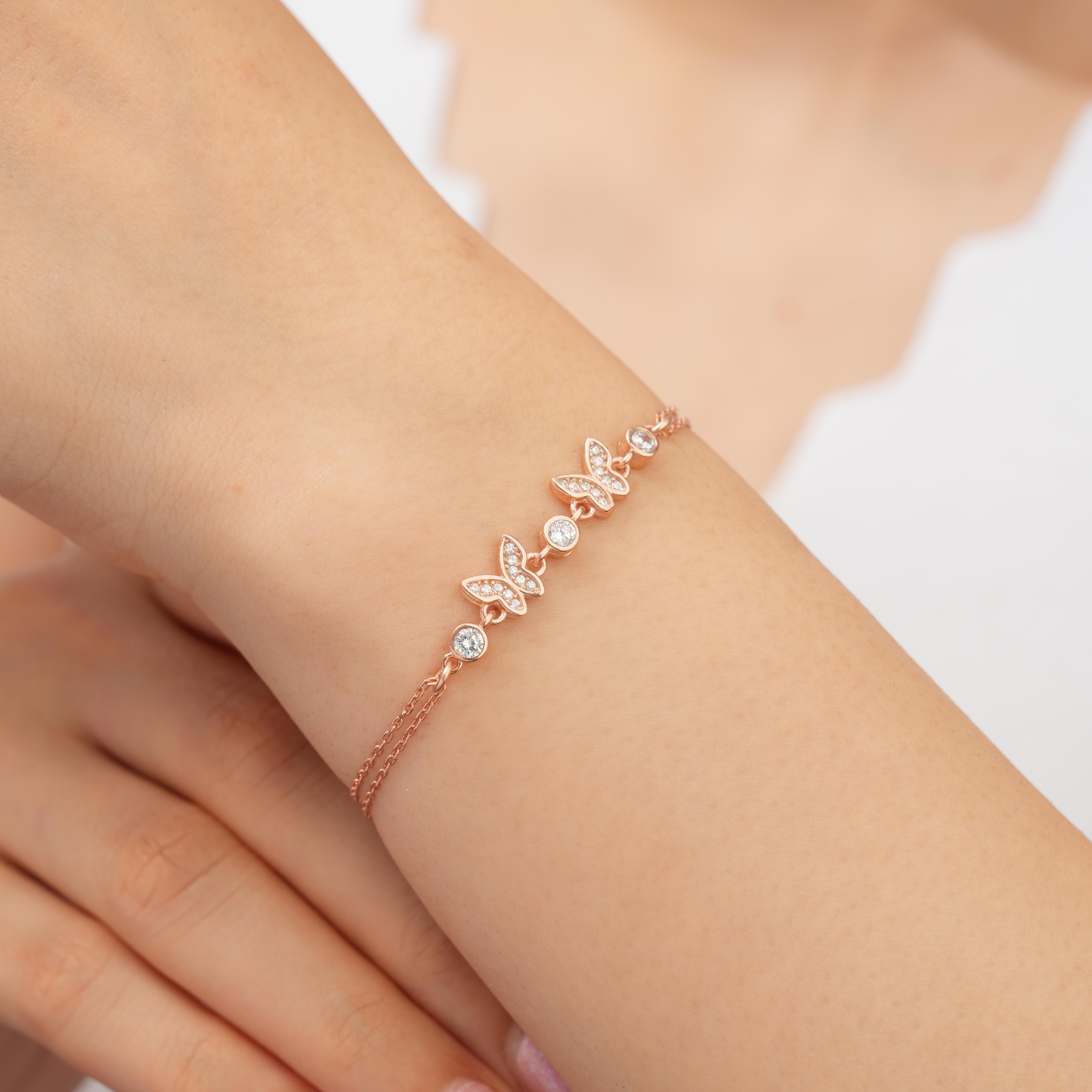 925 AYAR ROSE KAPLAMA ZİRKON TAŞLI ÇİFT KELEBEKLİ GÜMÜŞ BİLEKLİK