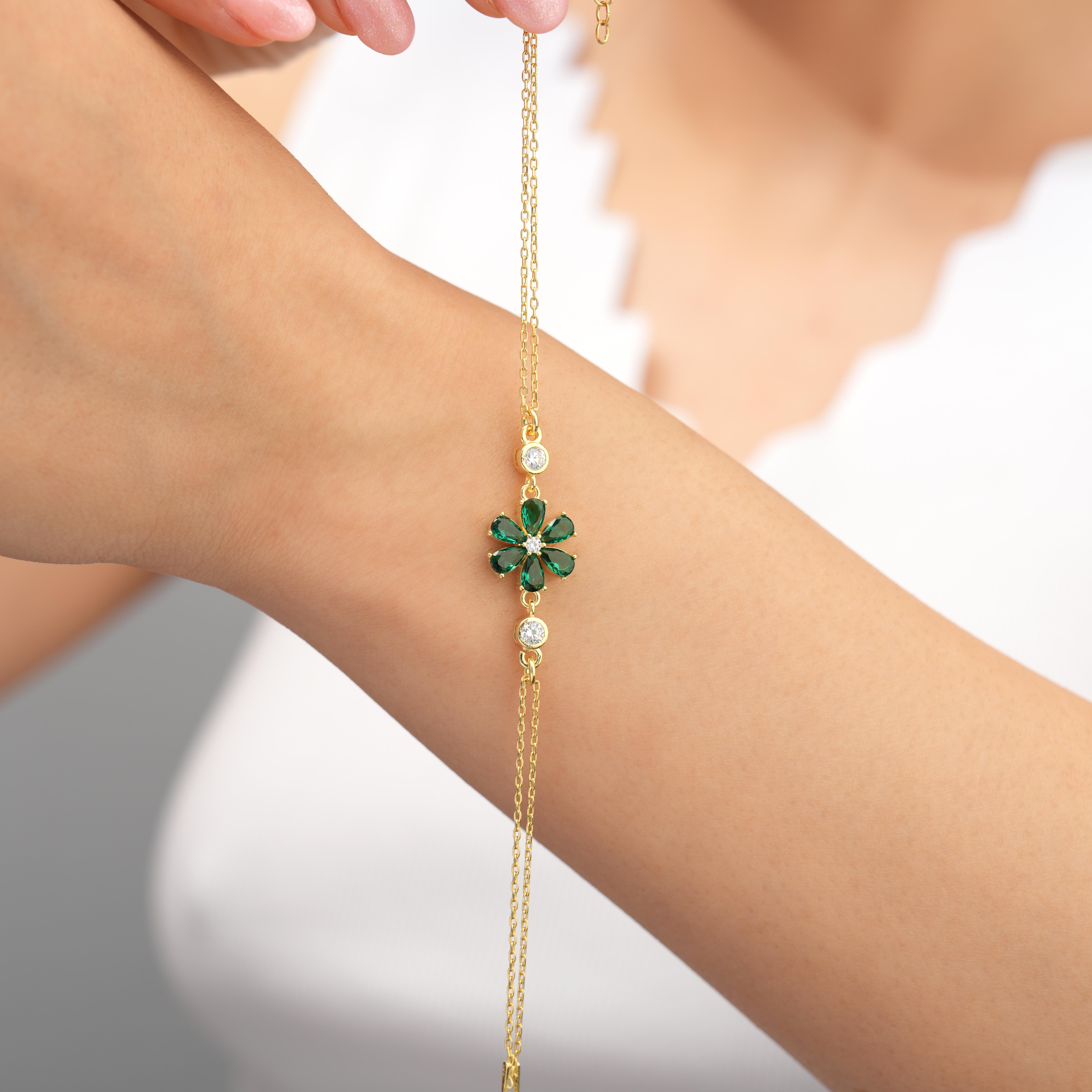 925 AYAR SARI ALTIN KAPLAMA ZÜMRÜT TAŞLI ÇİÇEK MODEL GÜMÜŞ BİLEKLİK